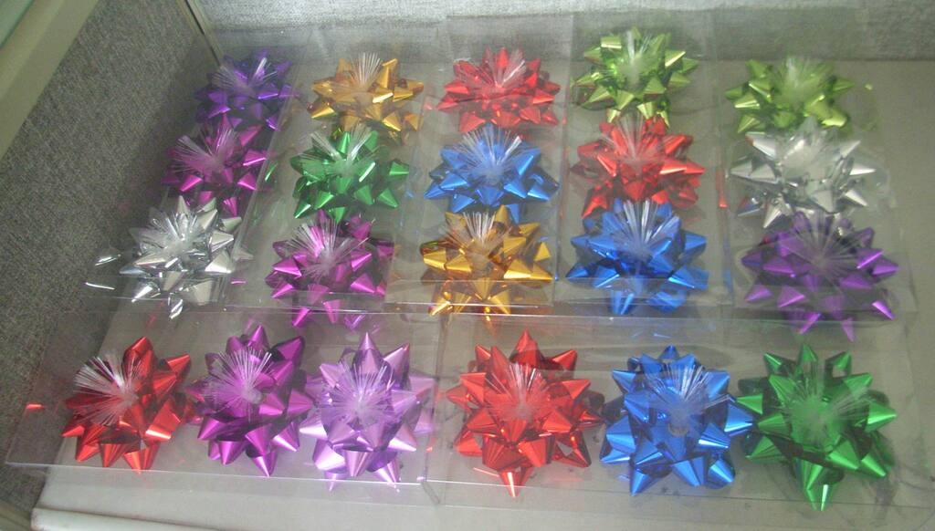 | Bow Size:18mm *4'' dia * 18 loops (with self-adhesive sticker at the back) | |
